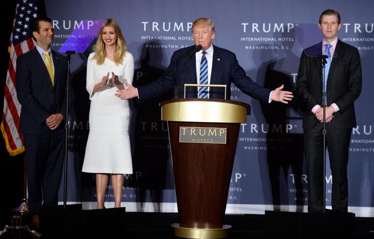 Photograph Republican presidential nominee Donald Trump (C) delivers remarks with his children (L-R) Donald Trump Jr., Ivanka Trump and Eric Trump at a ribbon cutting ceremony at Trump International Hotel on October 26, 2016 in Washington, DC.